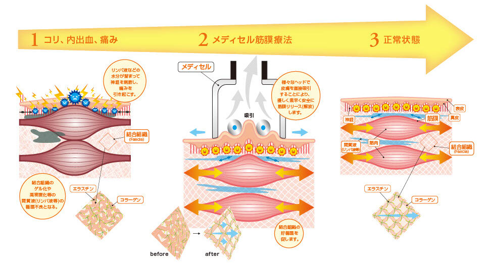 筋膜が絡まったり、皮膚や筋肉と癒着して固まってしまうとリンパ液等の流れが悪くなってしまい、むくみ、コリ、痛みの原因となります。